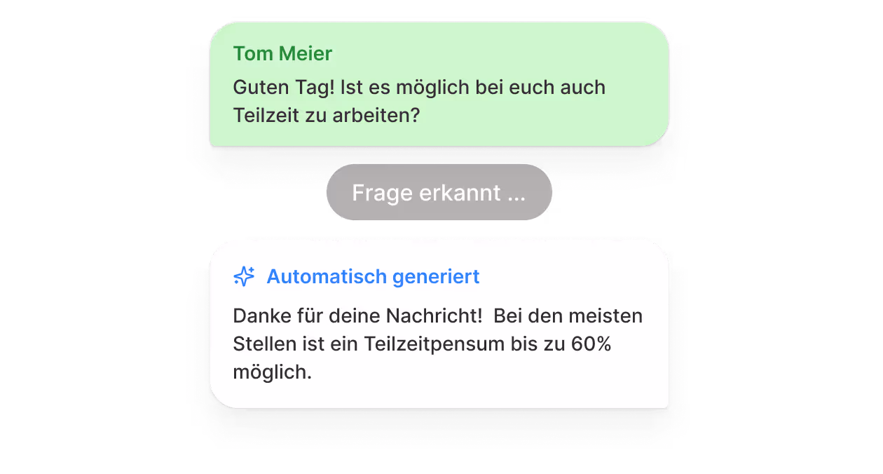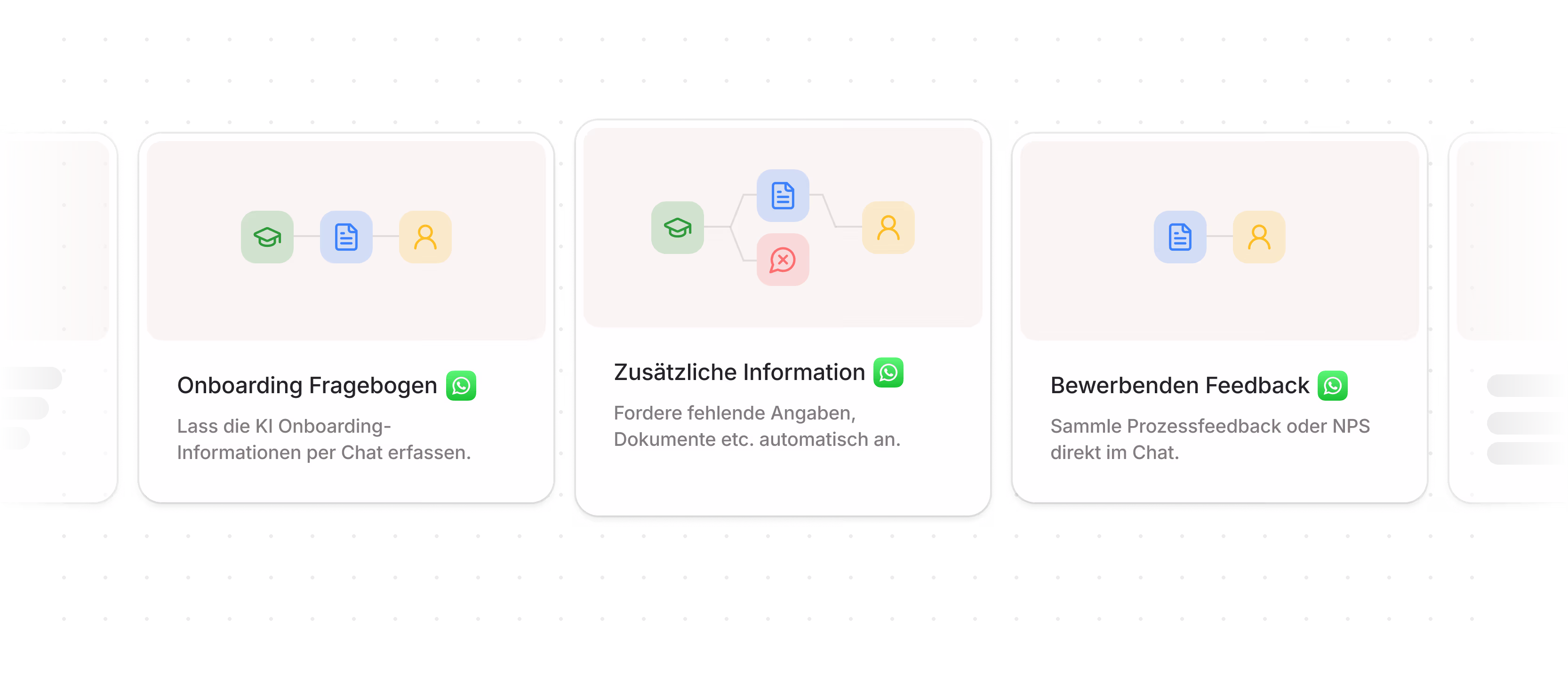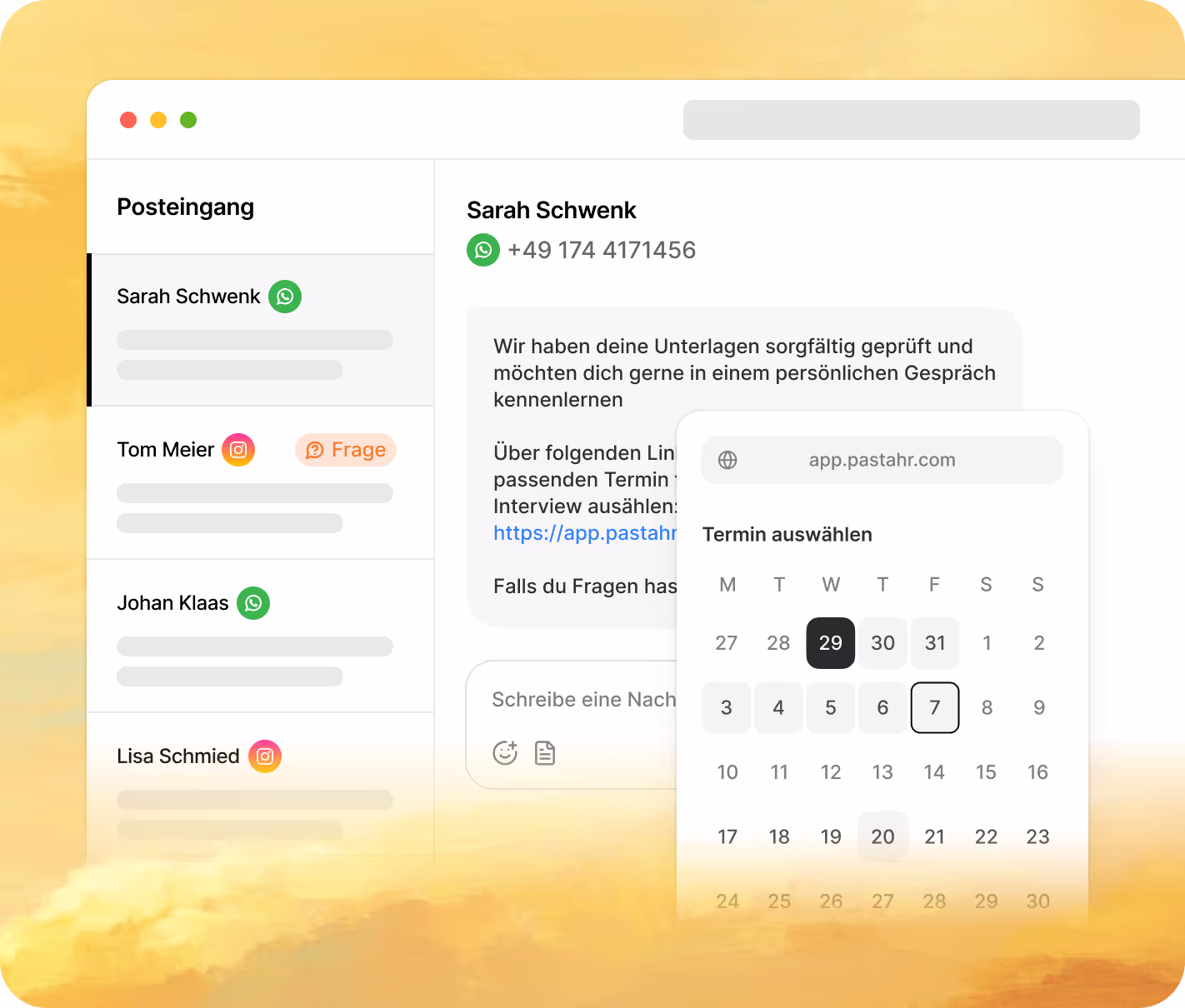 Führe Konversationen, beantworte FAQs mit KI und plane Interviews automatisch – alles direkt über WhatsApp & Co.