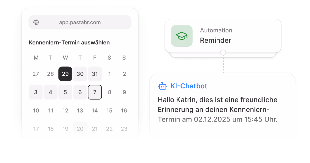 Die Kommunikation mit Bewerbenden findet in der PastaHR-Plattform statt, während alle Daten automatisch mit deinem BMS synchronisiert werden. Du entscheidest dabei selbst, ob du WhatsApp als erweiterten Kommunikationskanal nutzen möchtest. Die Integration in deine bestehenden Systeme ist nahtlos – keine doppelte Datenpflege nötig.