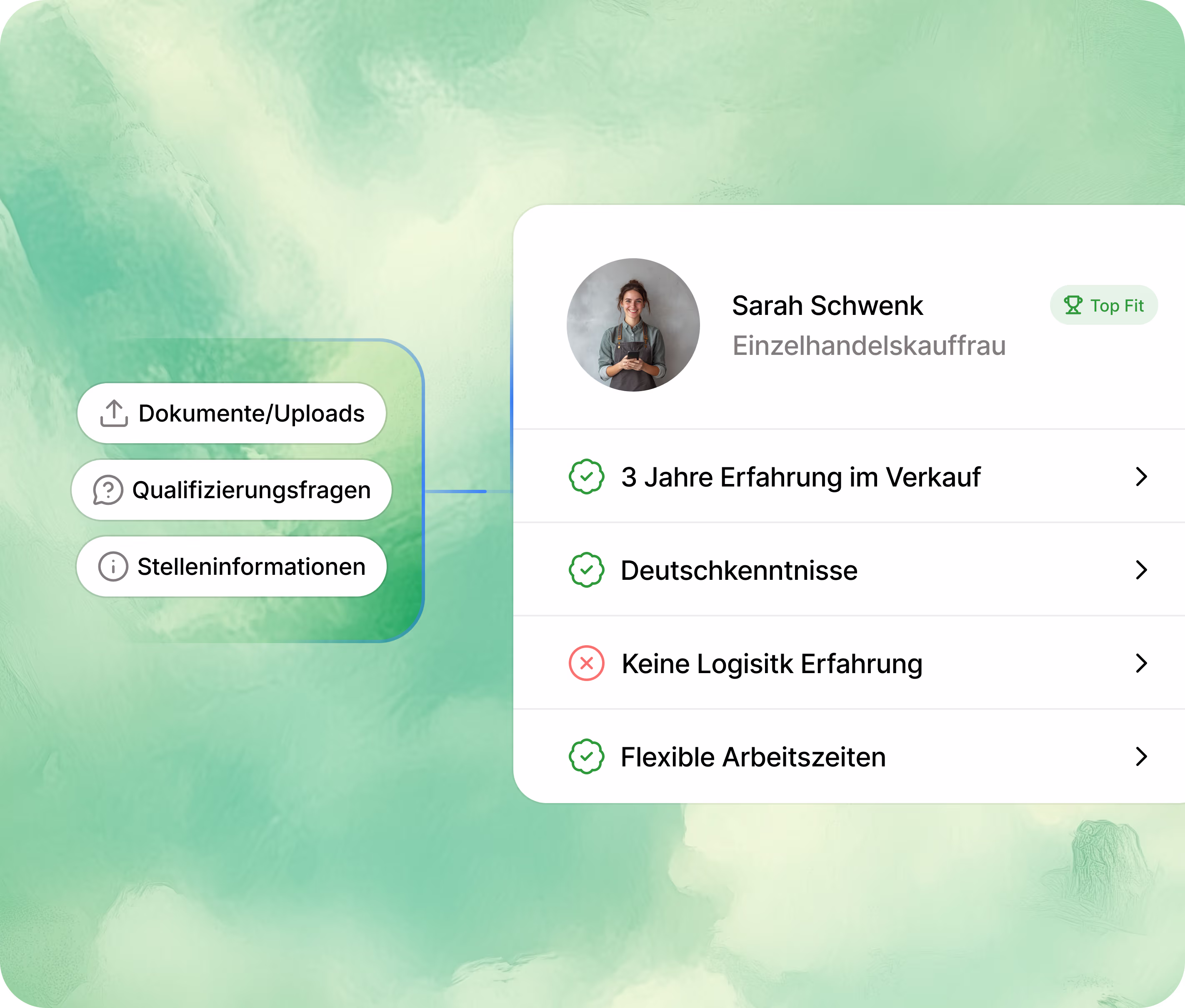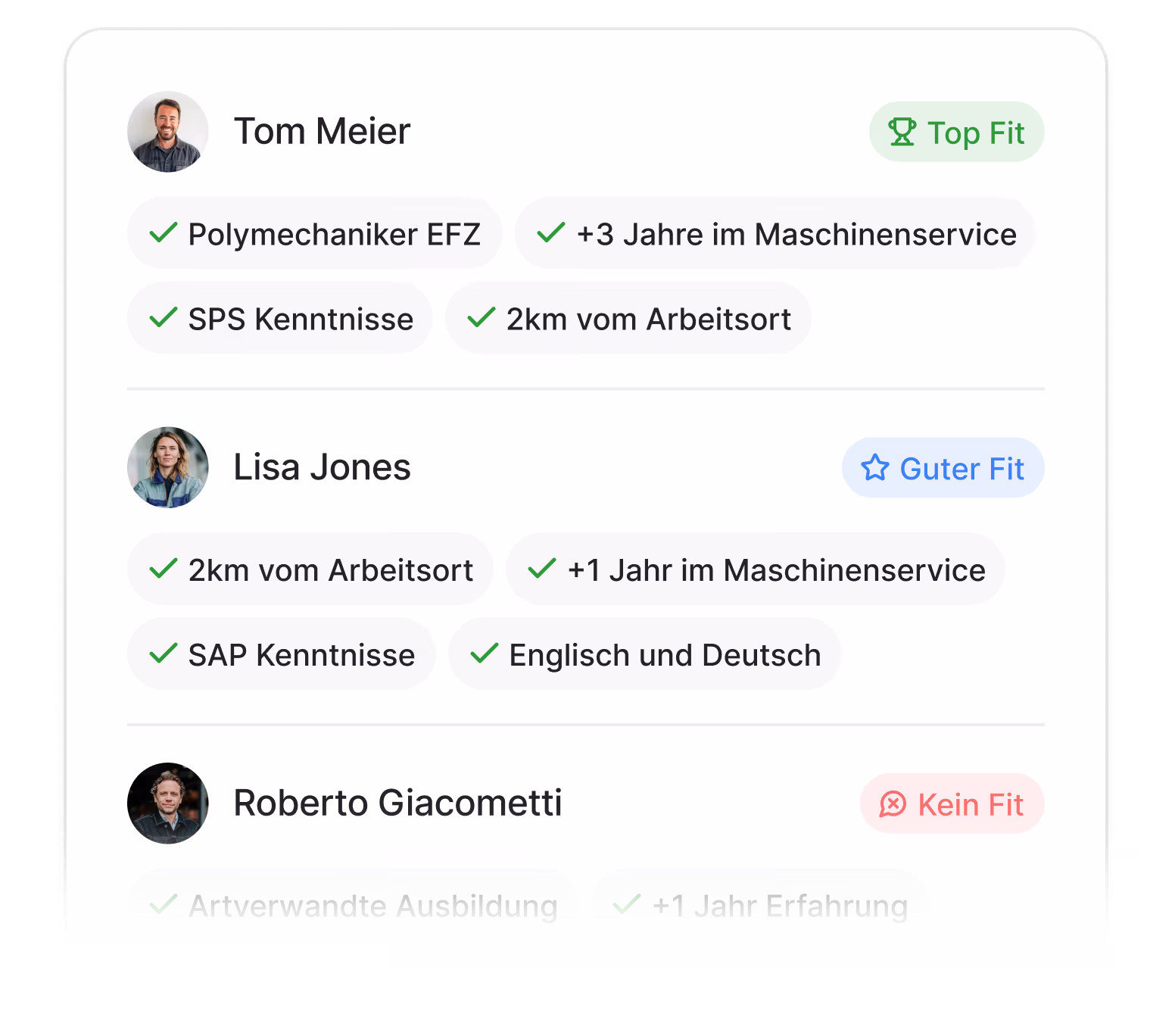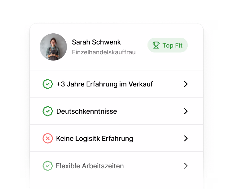 Der KI-gestützte Job-Fit zeigt dir die besten Kandidat:innen sofort und reduziert dein Screening-Aufwand um Stunden jeden Tag.