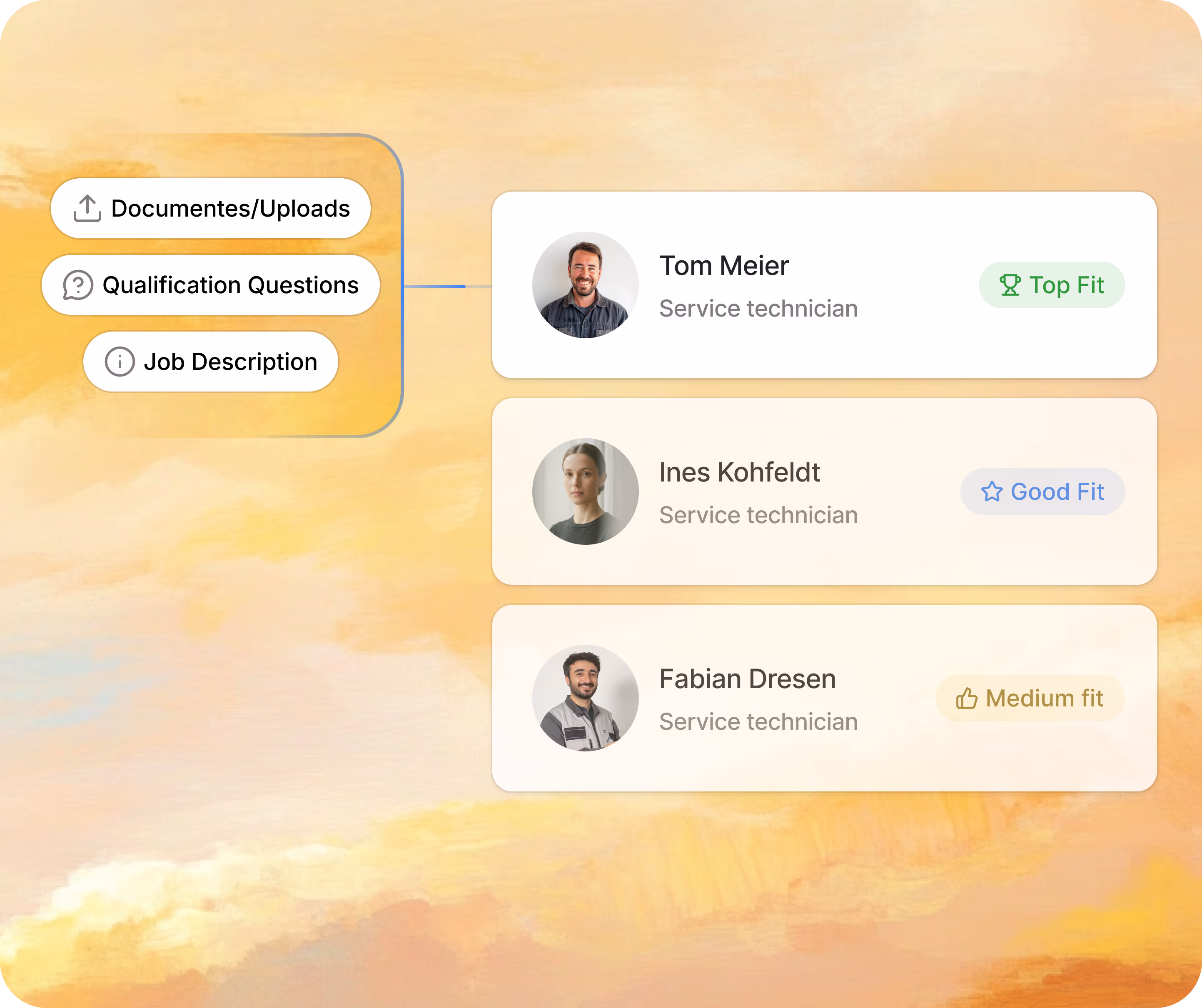AI creates qualification questions based on the position or your specifications. You determine the rules, question types and automations yourself. AI supports the process but does not make hiring decisions.
