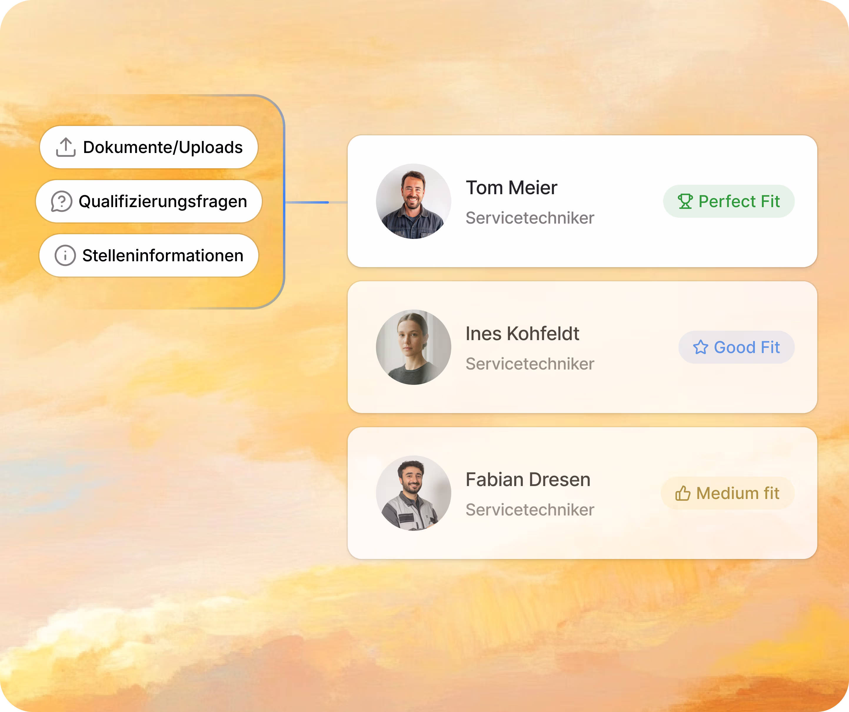 Der JobFit bewertet, wie gut Bewerbungen zur Stelle passen – auf Basis erklärbarer Kriterien. Recruiter sehen die Einschätzung und können jederzeit nachvollziehen, worauf Informationen und Scoring beruhen.