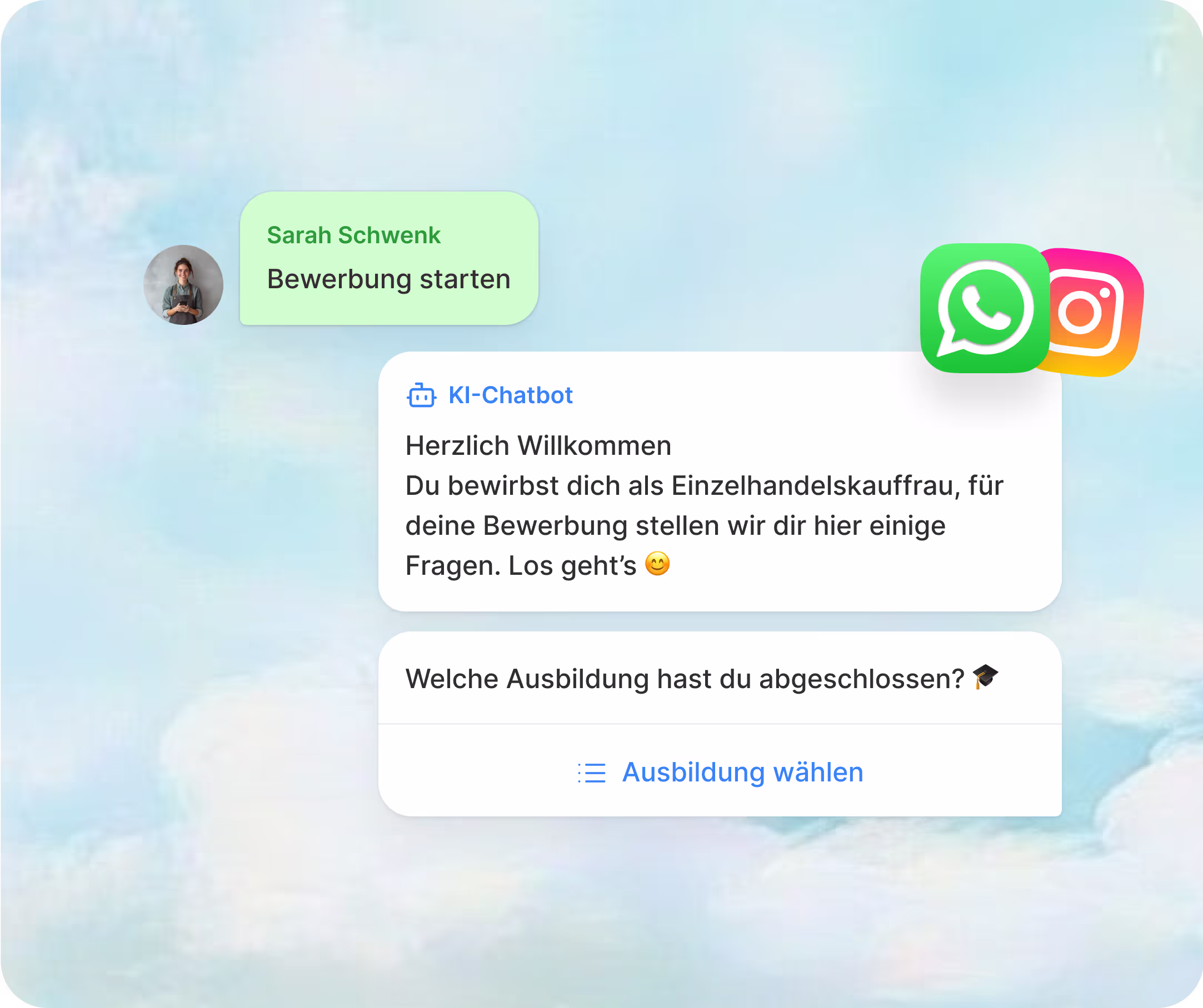 Kandidat:innen bewerben sich direkt über WhatsApp oder Instagram – in ihrer gewohnten Umgebung, ohne neue Apps oder Registrierung. Text, Audio oder Video: Die Bewerbung wird so flexibel wie ein normaler Chat.